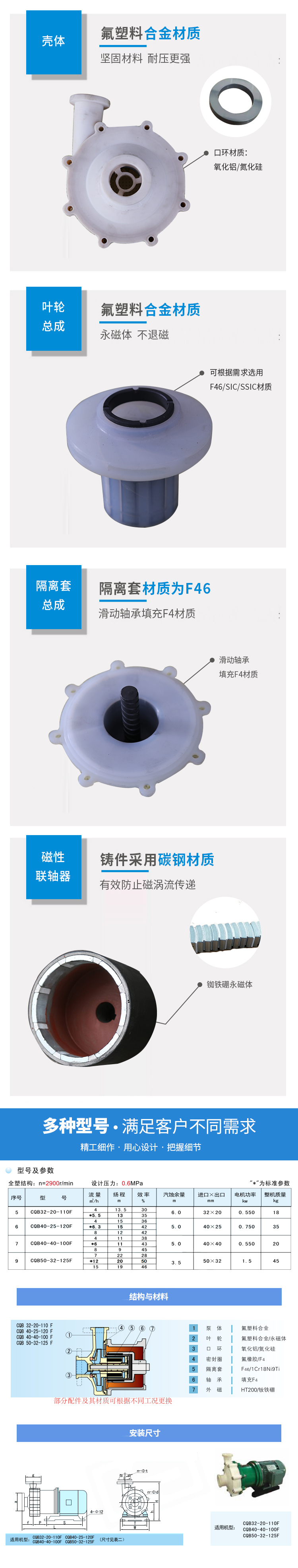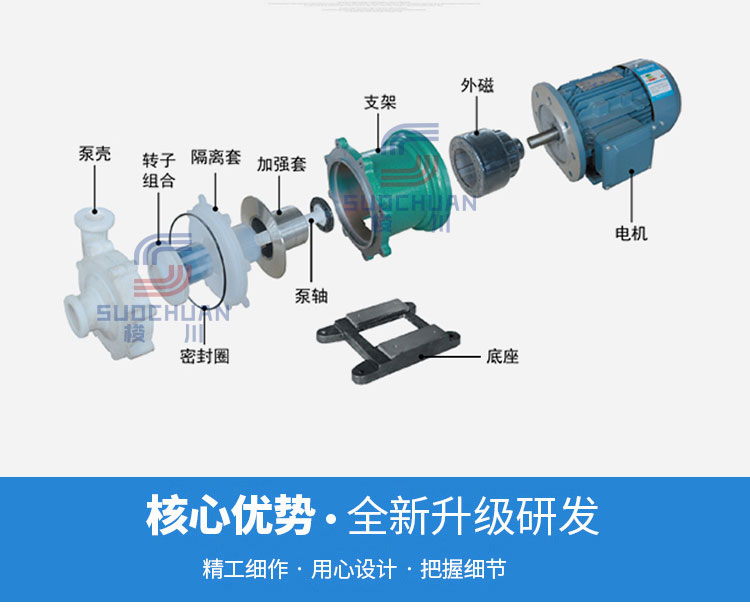 防漏設(shè)計(jì)取消了軸封,利用磁力耦合間接驅(qū)動(dòng),有效消除了滴漏的煩惱,絕不污染場(chǎng)地。由于泵的過流部分選用“氟塑料合金”制造。可連續(xù)輸送任意濃度的酸、堿、強(qiáng)氧化劑等腐蝕介質(zhì)而毫不受損。
